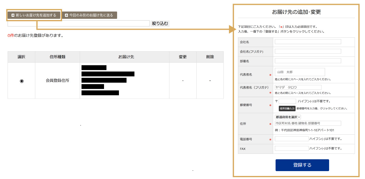 購入したい商品の商品番号・数量を入力し、お届け先を選択します。