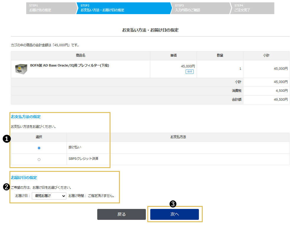 お届け先、支払方法を選択する
